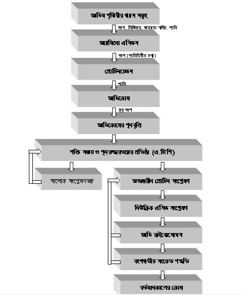চিত্রঃ আদিম পরিবেশ থেকে জৈববস্তুর উপত্তি ও তাদের আন্তঃসম্পর্ক ও বিক্রিয়ার মধ্য দিয়ে জীবনের উপত্তির রূপরেখা (আখতারুজ্জামান, ২০০৪)