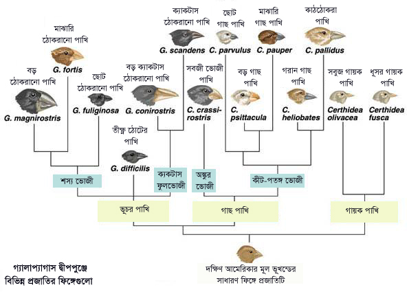 যদিও এই বীজ খেকো, গাছ খেকো ফিঙ্গে পাখিগুলো পতঙ্গভূক ফিঙ্গে পাখিগুলো থেকেই বিবর্তিত হয়েছে কিন্তু কোন বিবর্তনের সিঁড়ি অনুসারে পূর্বসূরিরা উত্তরসূরি অপেক্ষা উন্নত বা উচ্চশ্রেণীর নয়। গ্যালাপাগোস দ্বীপপুঞ্জে ফিঙ্গে পাখিদের বিবর্তন প্রাথমিকভাবে খাদ্যসংস্থানের উপর ভিত্তি করে তাড়িত হয়েছে; যেমন ভূমির ফিঙ্গে পাখিরা বীজ, গাছের ফিঙ্গে পাখিরা গাছের বাকল এবং ওয়ার্বলার ফিঙ্গে পাখিরা পতঙ্গের উপর নির্ভরশীল। যদি গ্যালাপাগোস দ্বীপপুঞ্জে কোন কারণে বীজের সংকট দেখা দিত, তবে বীজভূক ফিঙ্গে পাখিরা এই দ্বীপপুঞ্জ থেকে বিলুপ্ত হয়ে যেত আর প্রাচীন পতঙ্গভূক ফিঙ্গে প্রজাতির পাখিরা আরো ভালোভাবে টিকে থাকত। অর্থাৎ গ্যালাপাগোস দ্বীপপুঞ্জের ফিঙ্গে পাখির বৈচিত্র বিশ্লেষণ করে সহজেই বোঝা যায় যে, ‘উঁচু’-‘নীচু’ ধারণাটি জৈববিবর্তনের সাথে মোটেই সম্পর্কিত নয়। পরিবেশের সাথে খাপ খাইয়ে নেওয়ার ক্ষমতা বা অভিযোজন-ই বিবর্তনের প্রধানতম চাবিকাঠি।