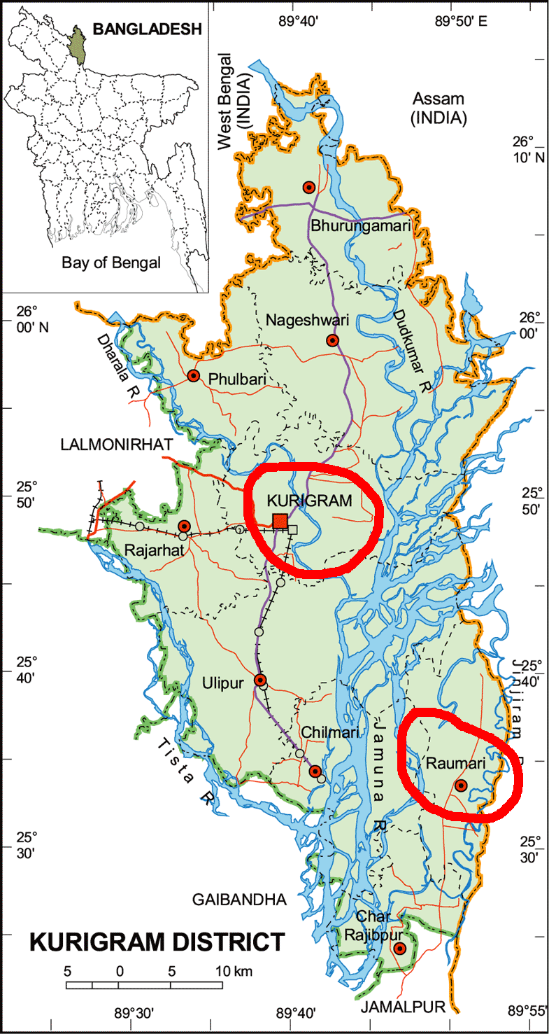 Roumari (sometimes written as Raumari) is a remote police station (Upazila) under Kurigram district in the north Bengal. On its north lies the district of Dhubri across the mighty Brahmaputra river and district of Goalpara on the right side of Brahmaputra, both the districts lying in the Indian state of Assam. In the east lies the range of Garo hills in Meghalaya of Indian state. In between lies a vast low land criss-crossing a few small rivers. In the south lies Dewanganj Upazila in Jamalpur district, whereas the great Brahmaputra forms the Western border or Roumari. Just across the river lies the ‘Bhaoyaia song’ famous Chilmari river port. The reader, if you are very careful, you will listen the poetic song ‘Hakao Gari Chilirmari Bandar, …. Oh Garial Bhai, …' in the lyrical murmur sounds of Brahmaputra when it is calm. Roumari was once a big char Island in the vast Brahmaputra riverbed, say more than 400 years ago. The eastern branch of Brahmaputra forming the natural boundary with present Meghalaya dried up gradually as a result of changing course of the river forming a vast low land. In the process the southern part of the island too, once separated from the eastern Bengal, which now forms the Rajibpur police station, joined with Dewanganj Upazila of Jamalpur district. The river Gingiram now separates Roumari-Rajibpur from the mainland.