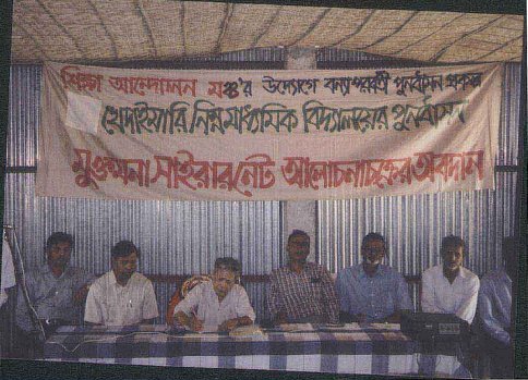At the beginning of the function our journalist friend Tapan gave a brief introduction of Mukto-Mona with and its humanitarian activities with special emphasis of its effort to collect fund for participating in post rehabilitation project related to education. He said that members of Mukto-Mona ‘are your sons and daughters’. The meeting was addressed by local elites those include Messers Alimul Haque, a local leader, Jasimuddin, Head master, Char Shoulmari High School, Shaiful Islam, Head master Khedaimari Lower secondary School, Azizul Haq Sarkar, Ex Head master, Roumari C. G. Zaman and High school and Shubhranbsu. Advocate Amzad Hosain, Chairman of the school committee presided the meeting, whereas Janab Abdul Aziz, a member of the school committee, conducted it. In my speech I thanked local people and the school committee and expressed my gratitude for giving us (the Mukto-Mona and Siksha Andalon Manch) a unique opportunity in ‘your effort to reconstruction and revalidation of the school’, to participate. I assured them on behalf of the Mukto-Mona that we ‘will give you a continued support within our limitation in reconstruction and reestablishment of the school.’ I ended my speech with handing over a cheque of sum of Tk 100,500/- (Taka One lakh five hundred) only formally to Advocate Mr. Amzad Hosain, Chairman of the School Committee on behalf of MUKTO-MONA with amidst applause.